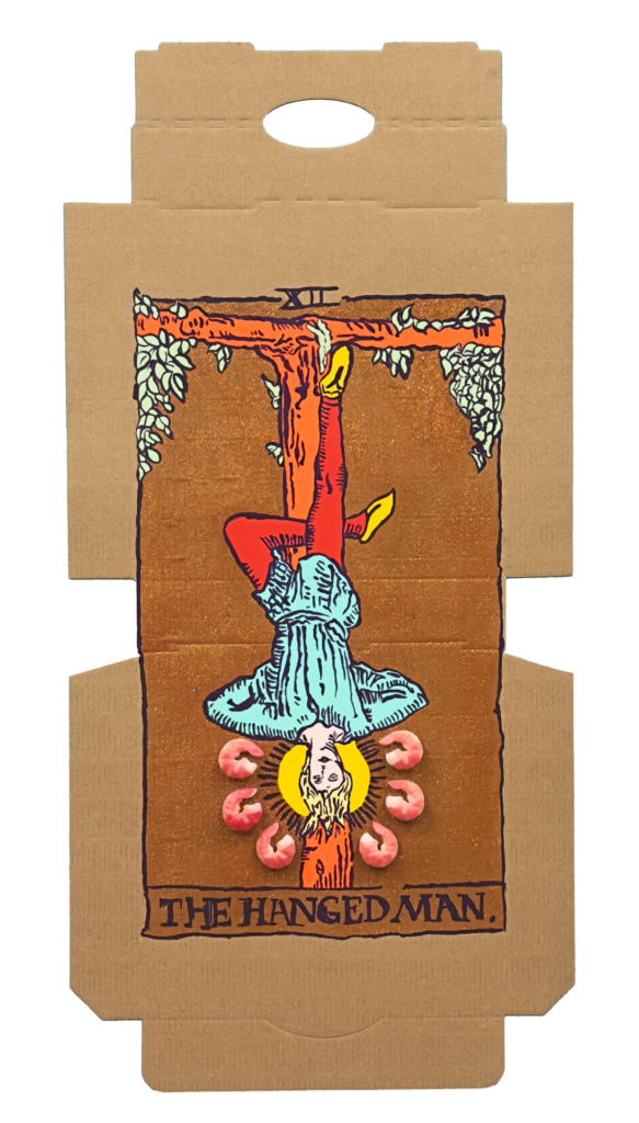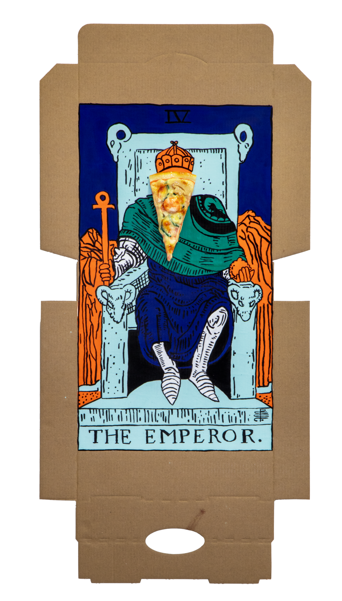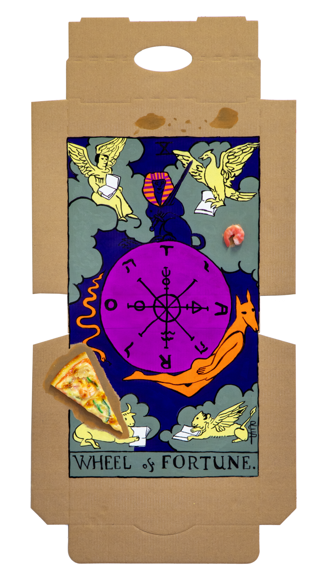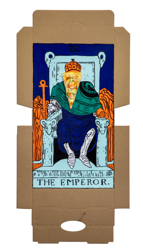 Tea, gristle, birds: these objects are the stuff of pre-internet life, if a new language of divination were to sprout up in our age, what would it be derived from? Our contemporary lives revolve around convenience. Foods that can be consumed without the need for cutlery use skills are double-plus-good. Burgers, hotdogs, pizzas and french fries are emblematic of our culture that doesn’t have the time for utensils nor excessive mastication. Our proposition that dirty pizza boxes may be used as a tool for divination is a reflection of our present state of being. Tomato, cheese, oil, olives, etc pasted upon cardboard can be employed like the lines in the palm of your hand: predicting the events of the future. With pizza divination, you don’t even have to get off the couch to get your fortune told.