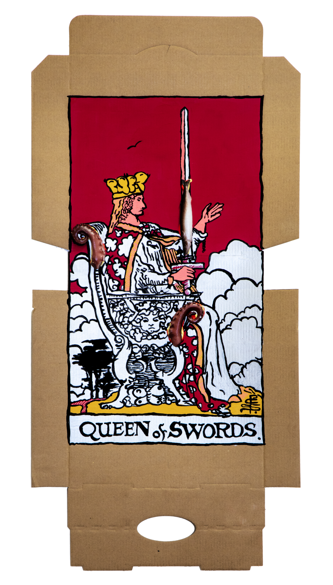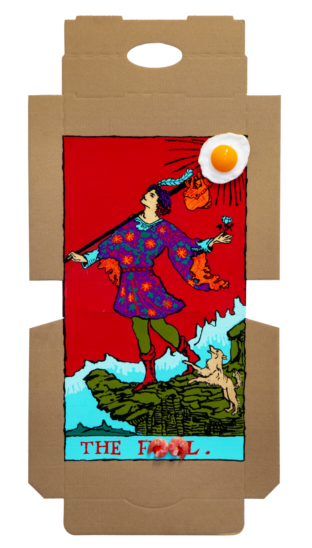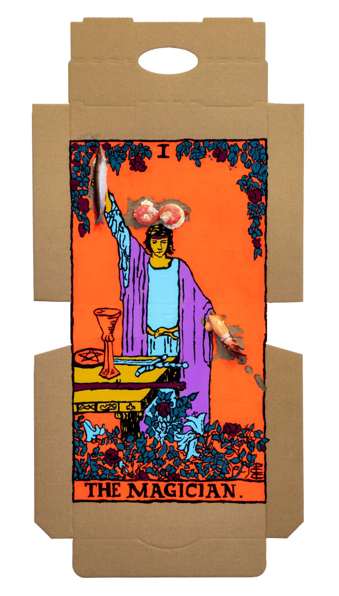 Tea, gristle, birds: these objects are the stuff of pre-internet life, if a new language of divination were to sprout up in our age, what would it be derived from? Our contemporary lives revolve around convenience. Foods that can be consumed without the need for cutlery use skills are double-plus-good. Burgers, hotdogs, pizzas and french fries are emblematic of our culture that doesn’t have the time for utensils nor excessive mastication. Our proposition that dirty pizza boxes may be used as a tool for divination is a reflection of our present state of being. Tomato, cheese, oil, olives, etc pasted upon cardboard can be employed like the lines in the palm of your hand: predicting the events of the future. With pizza divination, you don’t even have to get off the couch to get your fortune told.
