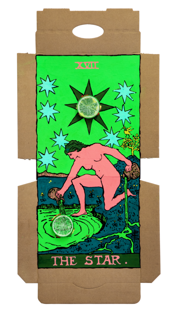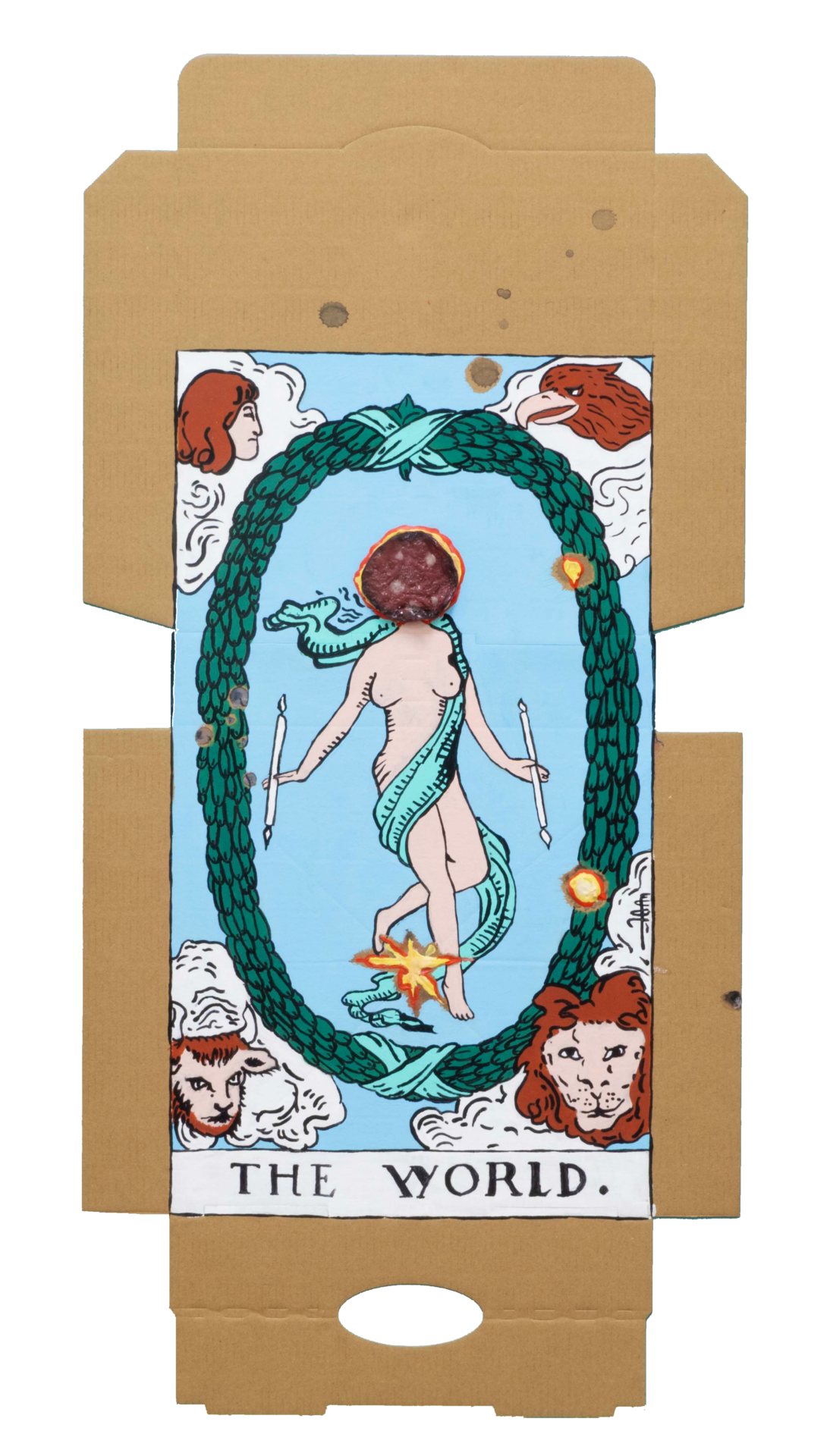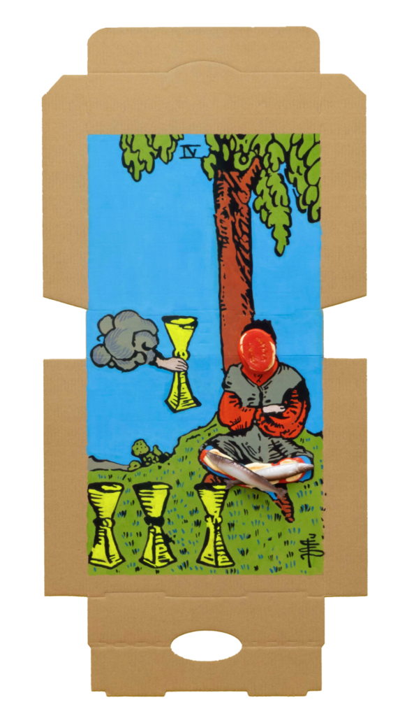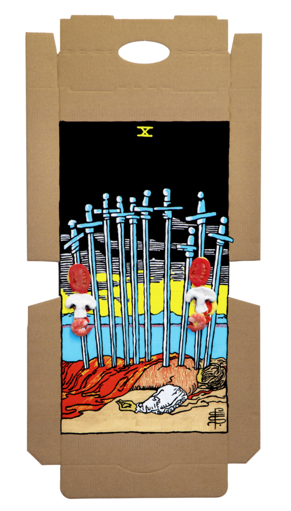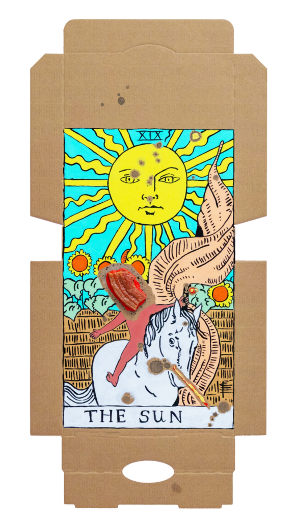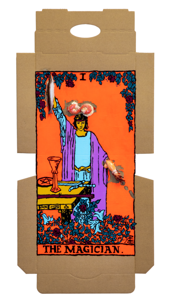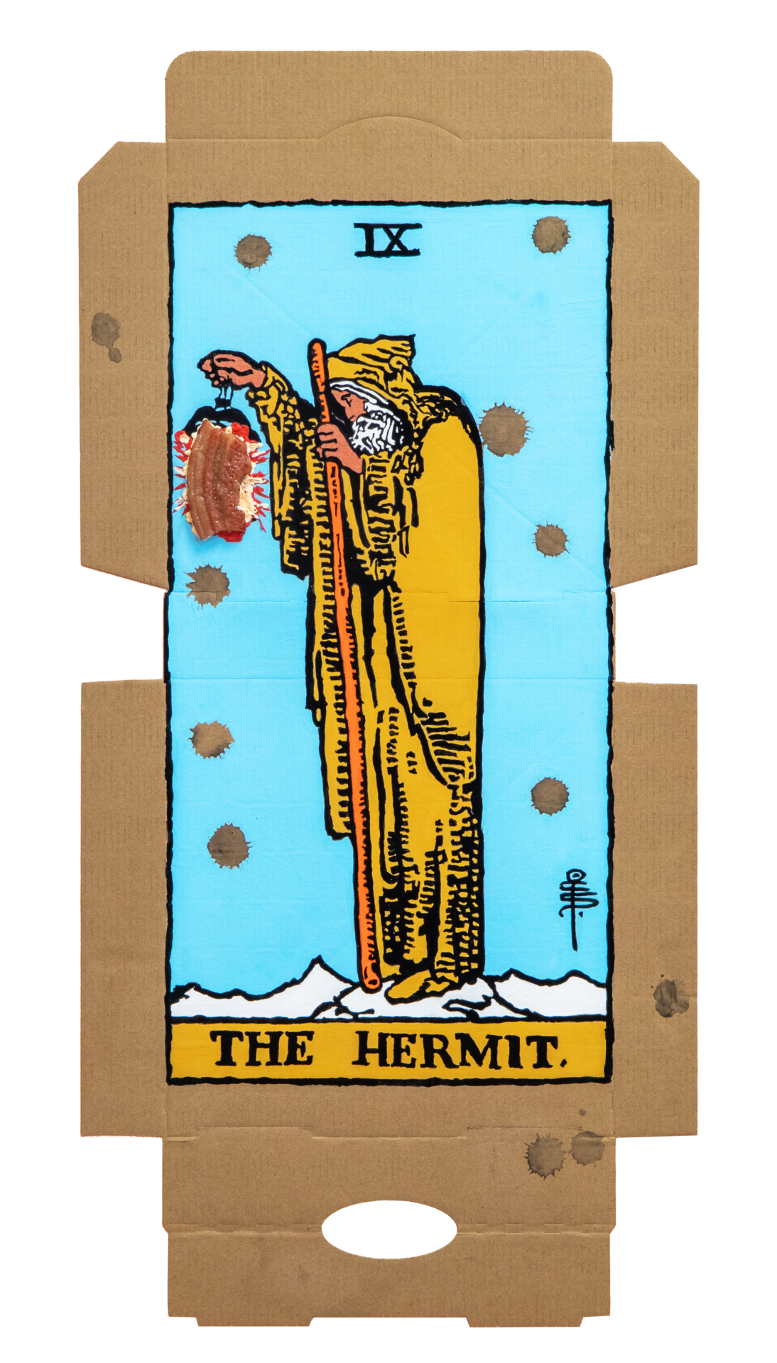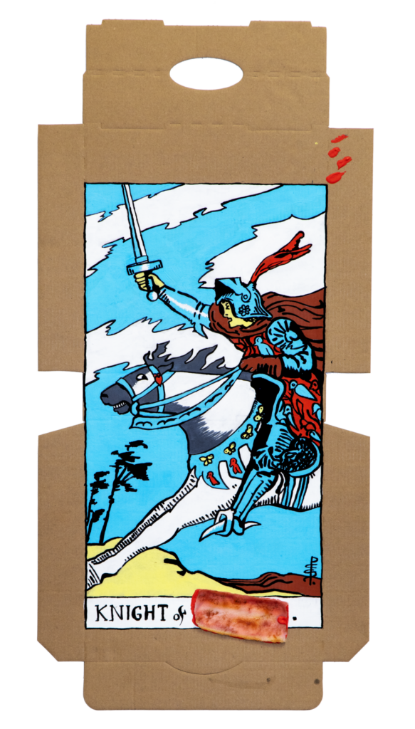 In our algorithm-led age, the pool of information we use to support our world view gets more and more narrow. We end up creating our own ridges and lines upon the palm which we read our future. Cheese Grease Geomancy uses food stains like stars in a constellation. Each pattern created by the remnant food informs an image that relates to a card from the Rider Waite Smith Tarot deck. A tarot reading generated not via the shuffling of a deck but through sloppy consumption of a pizza pie. These greasy constellations can be used to predict our future! A future that we are sure will be easy to swallow.