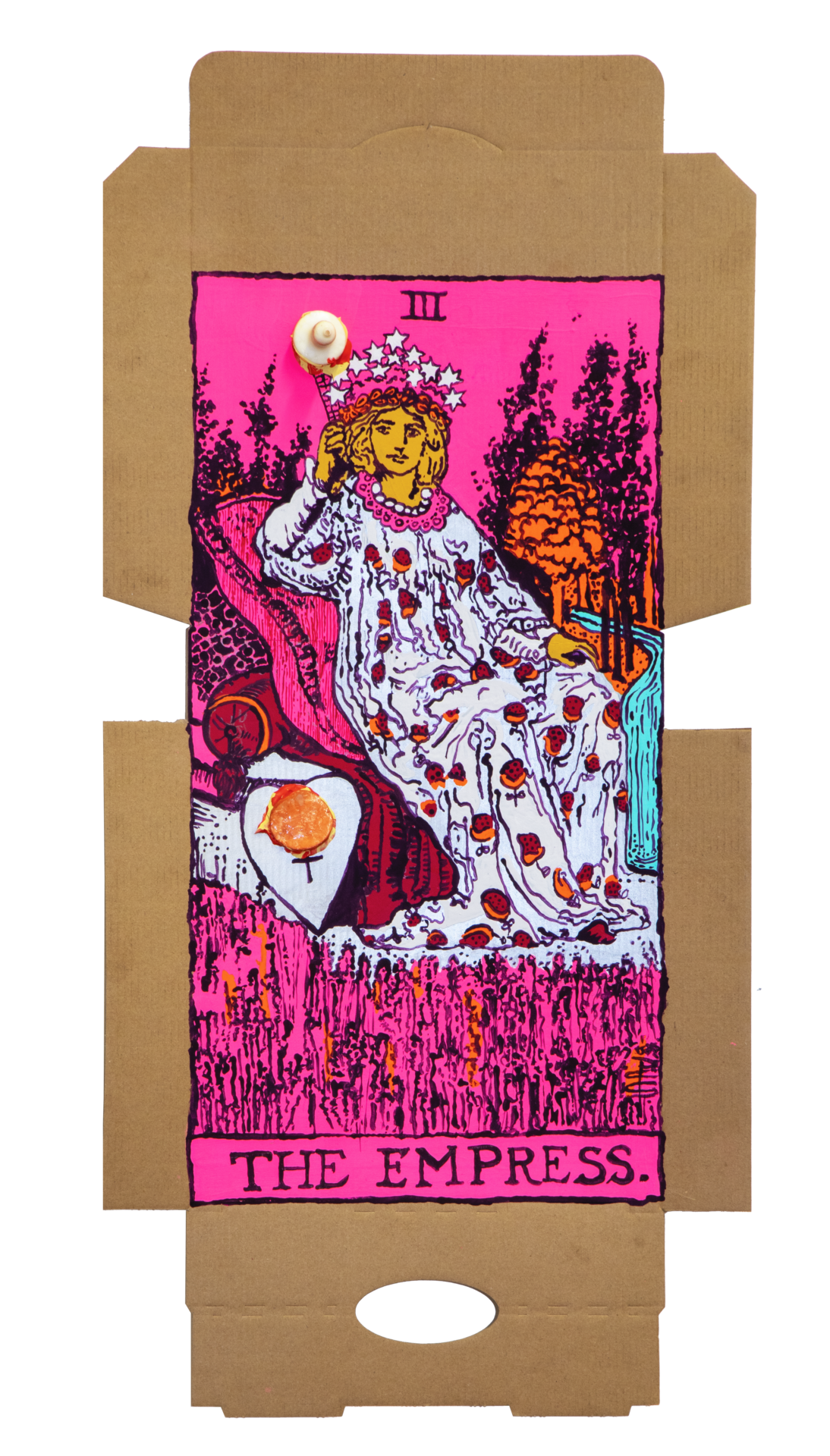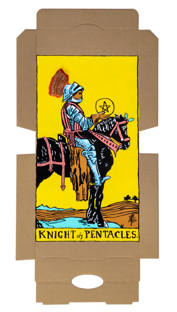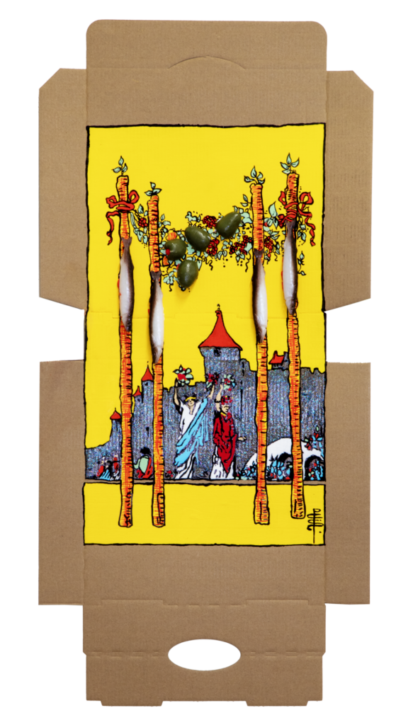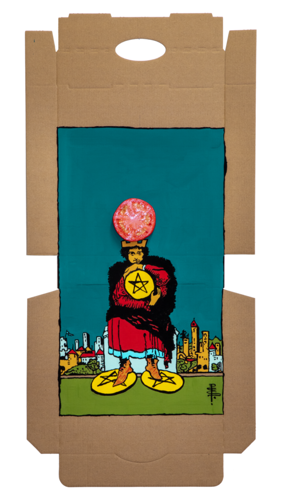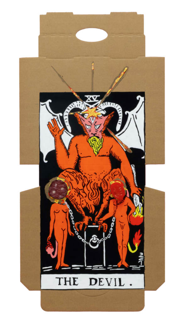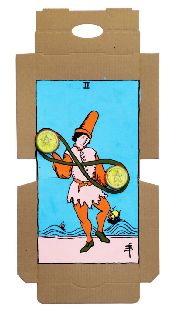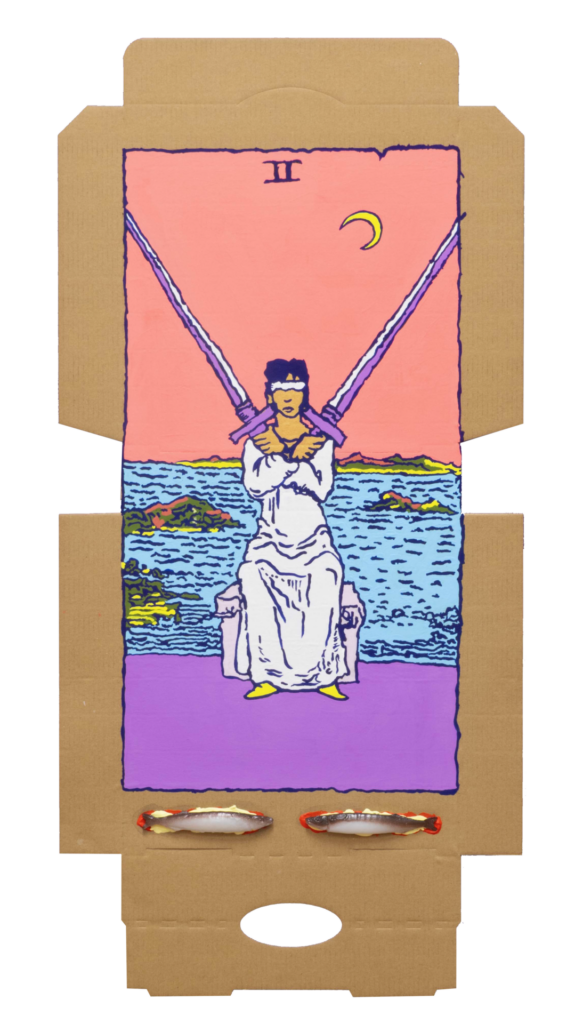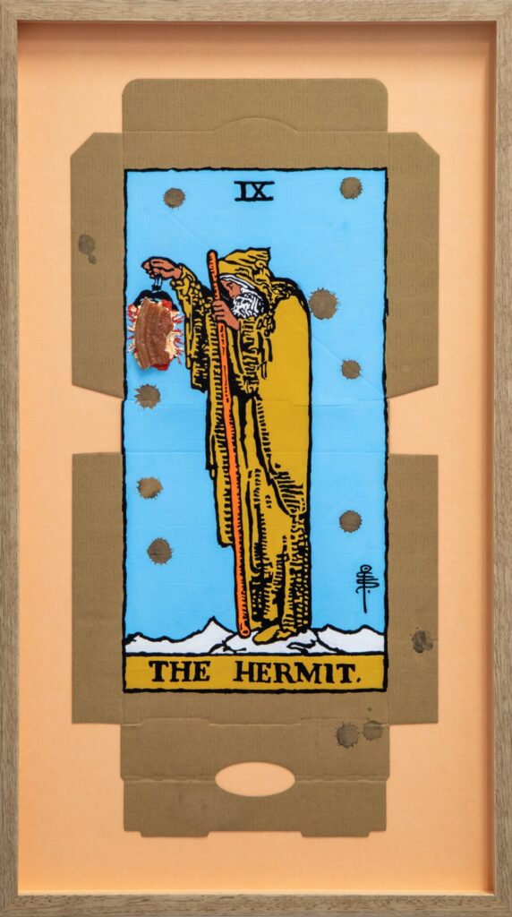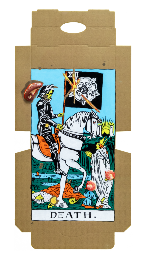 In our algorithm-led age, the pool of information we use to support our world view gets more and more narrow. We end up creating our own ridges and lines upon the palm which we read our future. Cheese Grease Geomancy uses food stains like stars in a constellation. Each pattern created by the remnant food informs an image that relates to a card from the Rider Waite Smith Tarot deck. A tarot reading generated not via the shuffling of a deck but through sloppy consumption of a pizza pie. These greasy constellations can be used to predict our future! A future that we are sure will be easy to swallow.