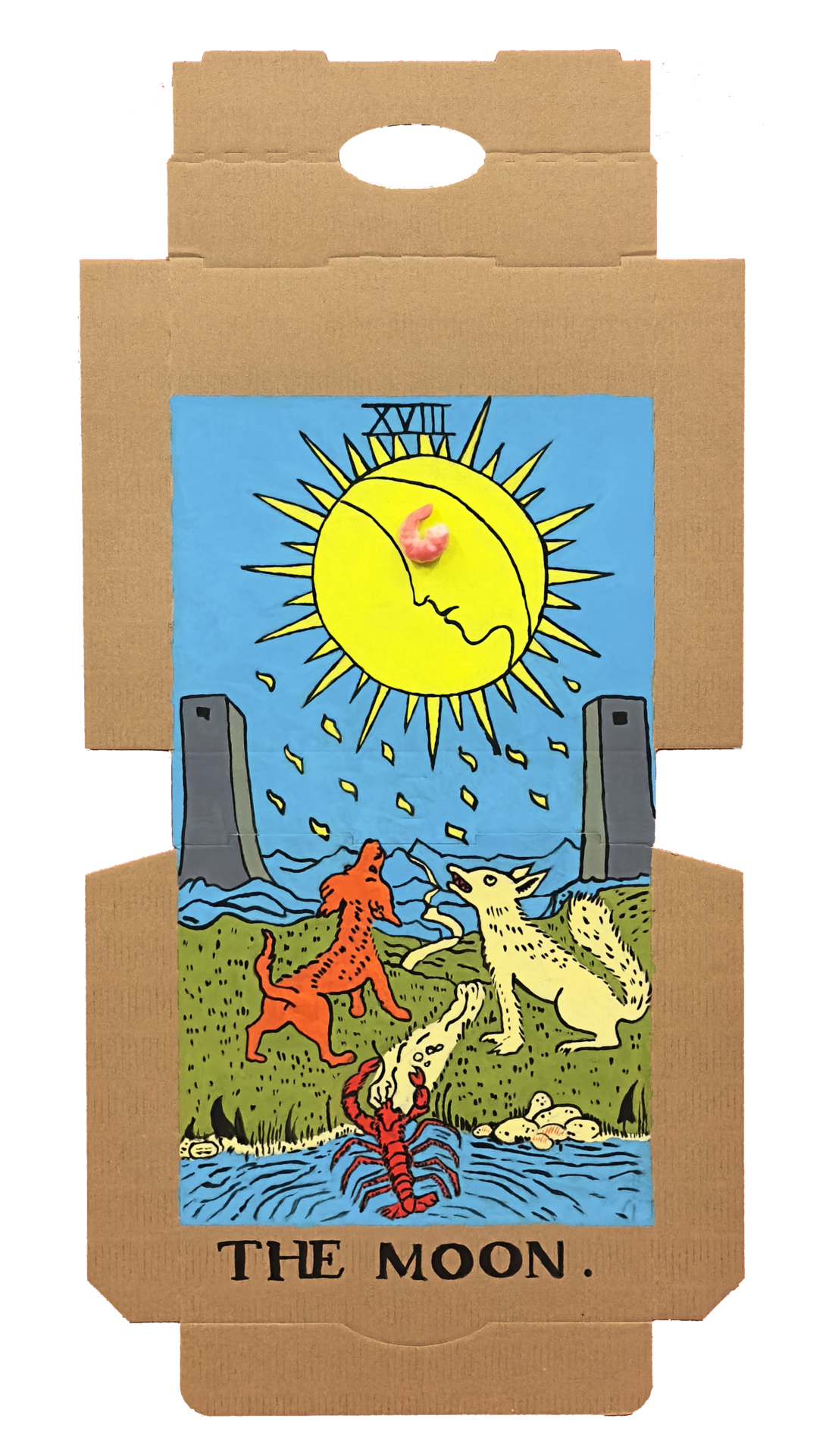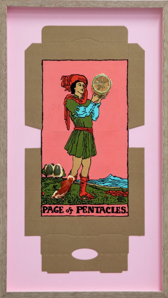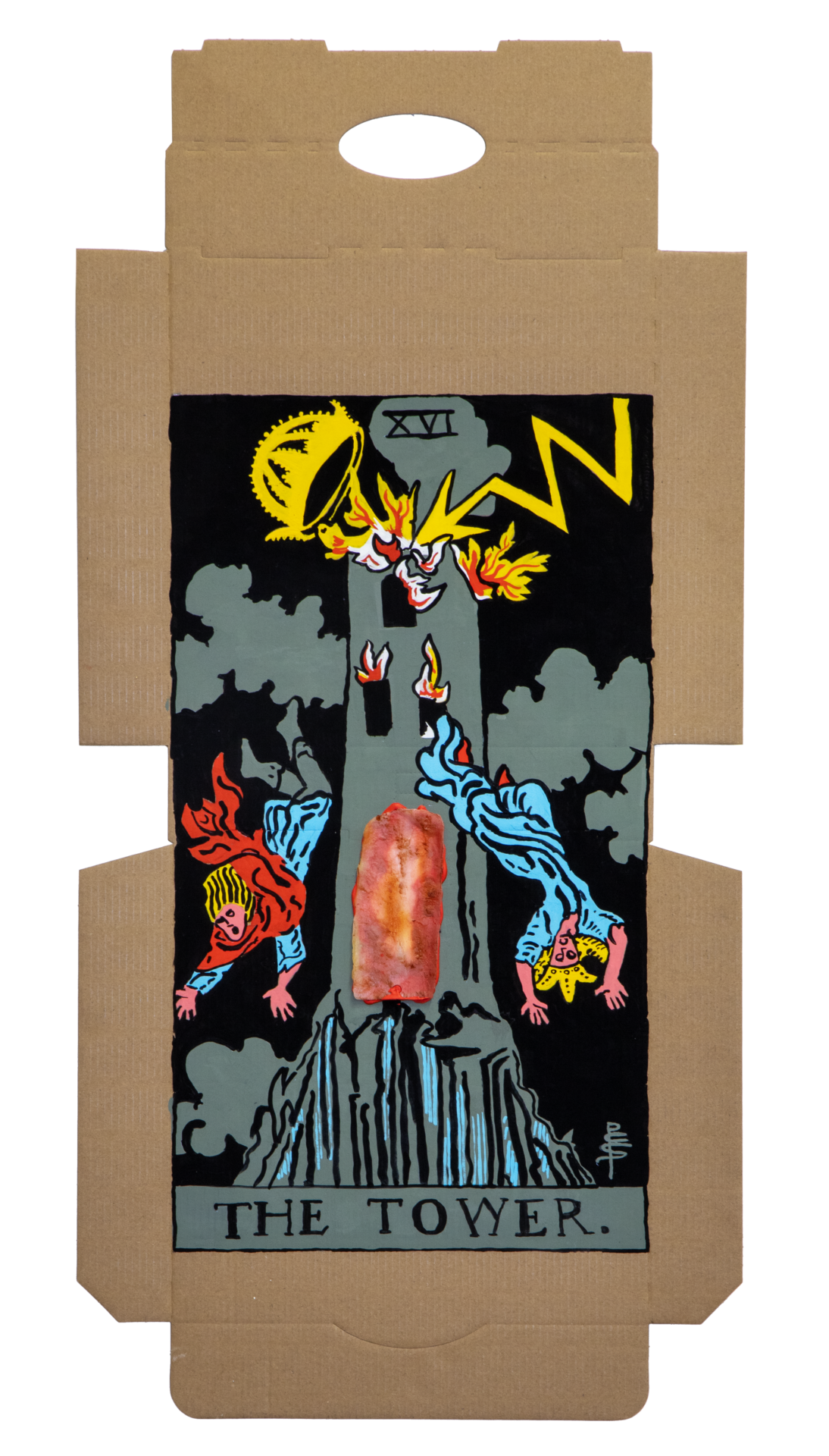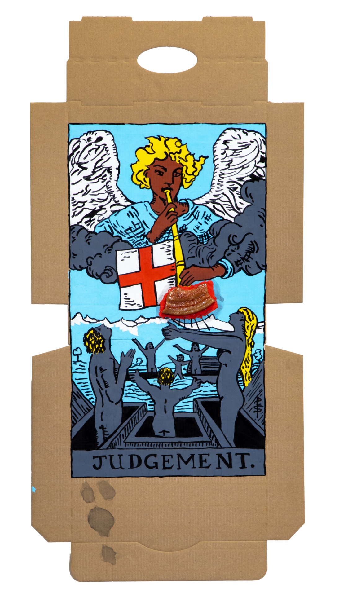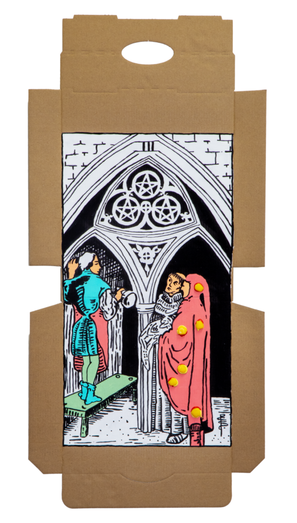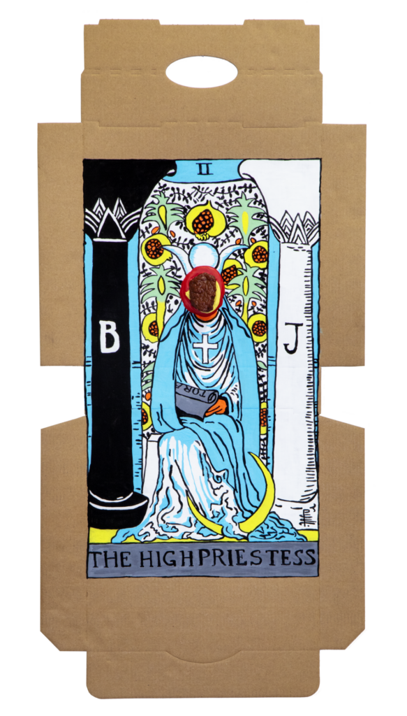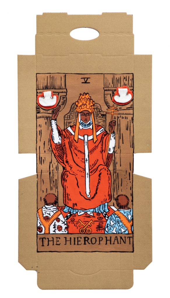In our algorithm-led age, the pool of information we use to support our world view gets more and more narrow. We end up creating our own ridges and lines upon the palm which we read our future. Cheese Grease Geomancy uses food stains like stars in a constellation. Each pattern created by the remnant food informs an image that relates to a card from the Rider Waite Smith Tarot deck. A tarot reading generated not via the shuffling of a deck but through sloppy consumption of a pizza pie. These greasy constellations can be used to predict our future! A future that we are sure will be easy to swallow.