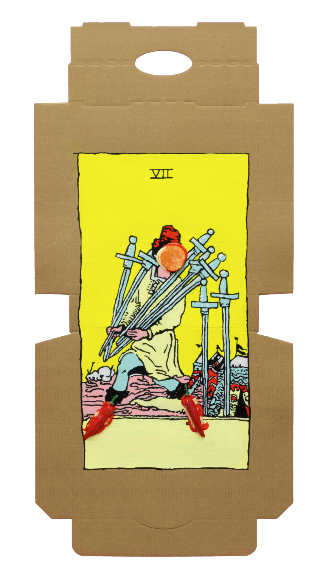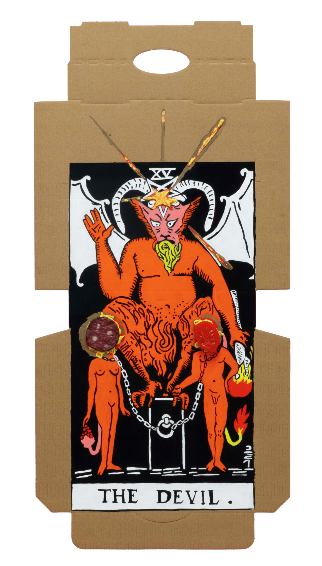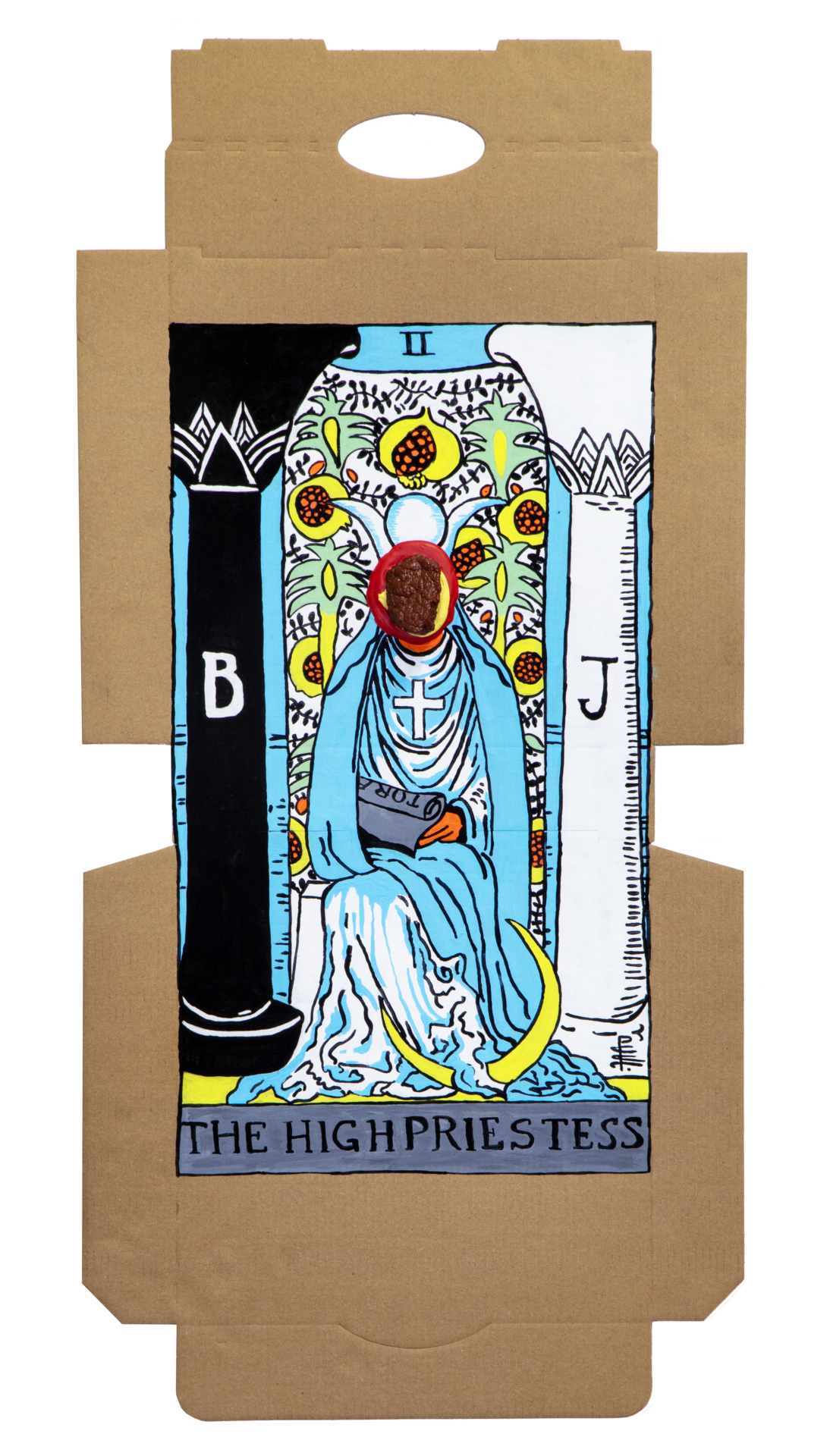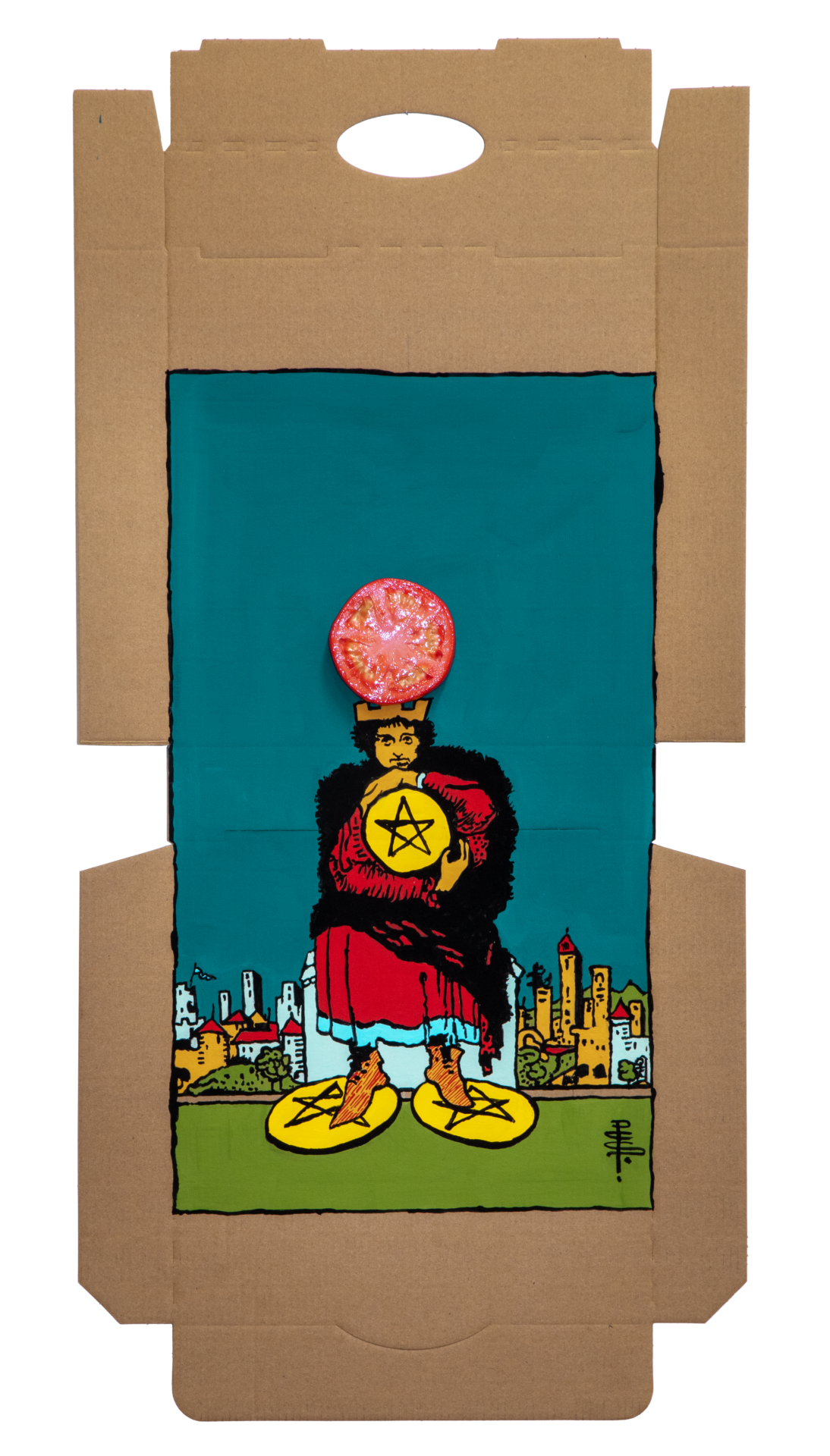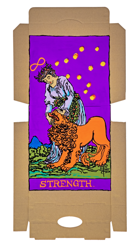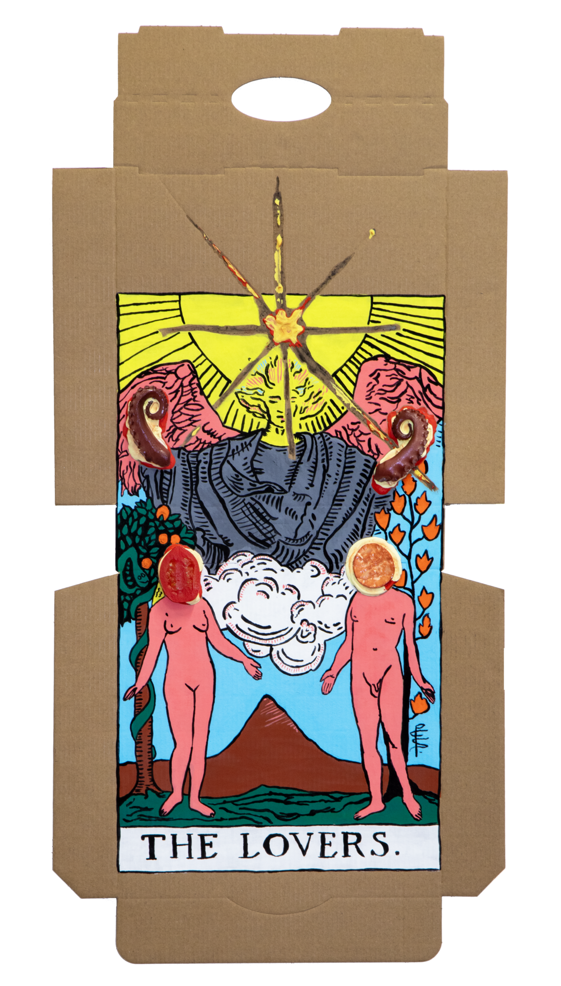 In our algorithm-led age, the pool of information we use to support our world view gets more and more narrow. We end up creating our own ridges and lines upon the palm which we read our future. Cheese Grease Geomancy uses food stains like stars in a constellation. Each pattern created by the remnant food informs an image that relates to a card from the Rider Waite Smith Tarot deck. A tarot reading generated not via the shuffling of a deck but through sloppy consumption of a pizza pie. These greasy constellations can be used to predict our future! A future that we are sure will be easy to swallow.