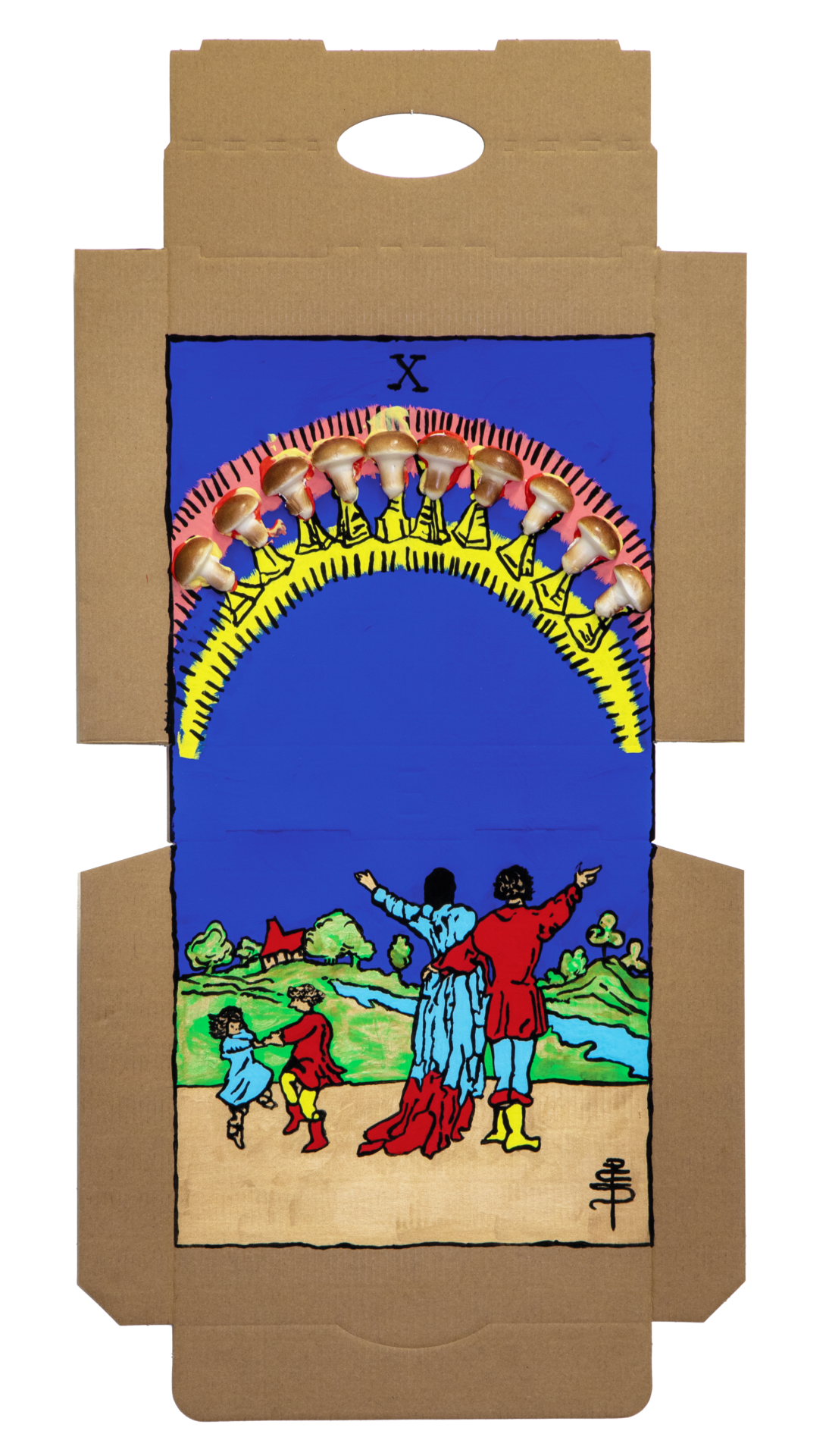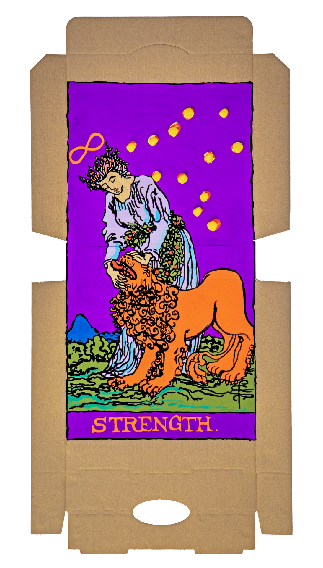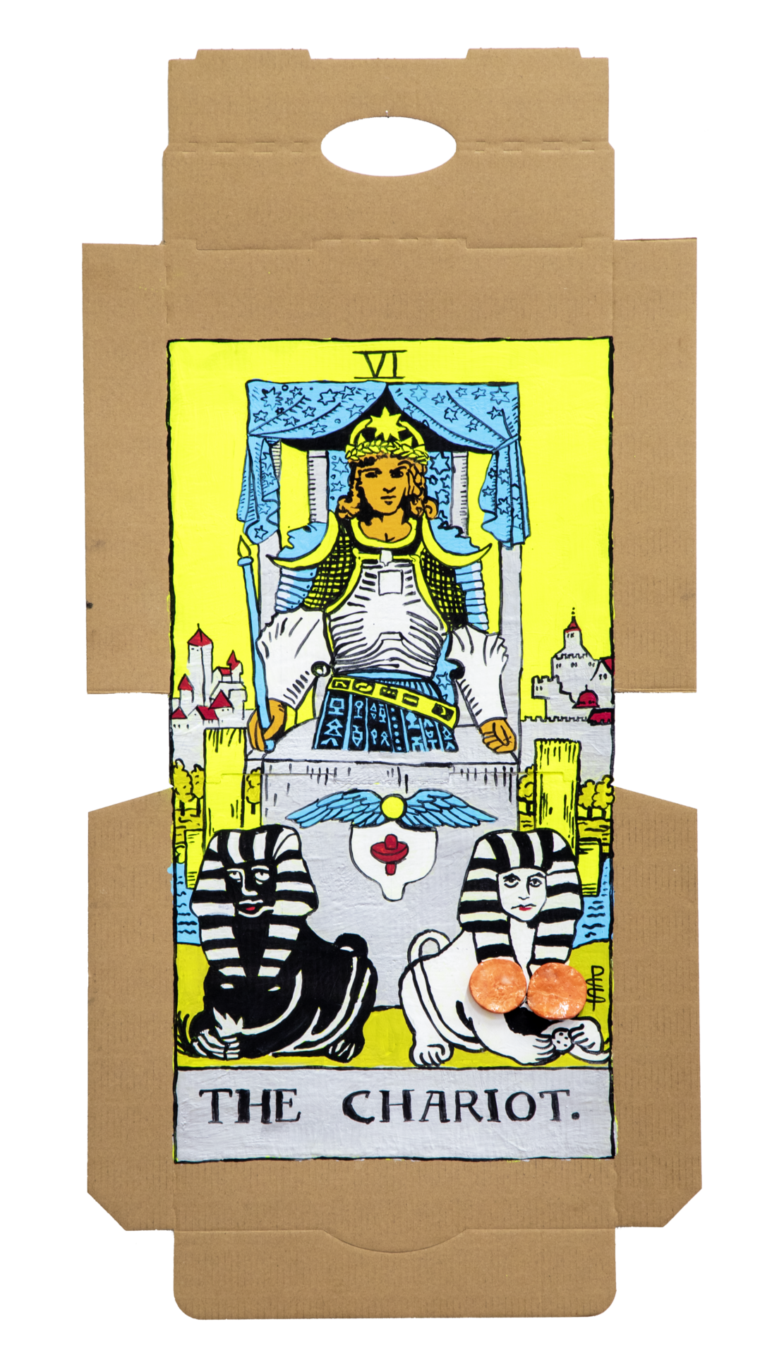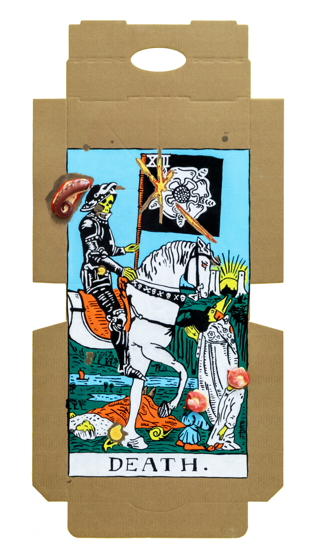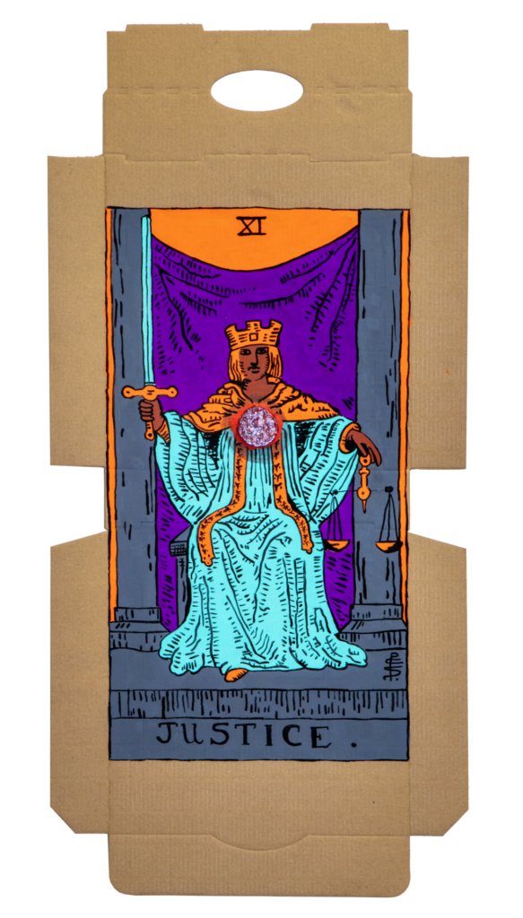 In our algorithm-led age, the pool of information we use to support our world view gets more and more narrow. We end up creating our own ridges and lines upon the palm which we read our future. Cheese Grease Geomancy uses food stains like stars in a constellation. Each pattern created by the remnant food informs an image that relates to a card from the Rider Waite Smith Tarot deck. A tarot reading generated not via the shuffling of a deck but through sloppy consumption of a pizza pie. These greasy constellations can be used to predict our future! A future that we are sure will be easy to swallow.